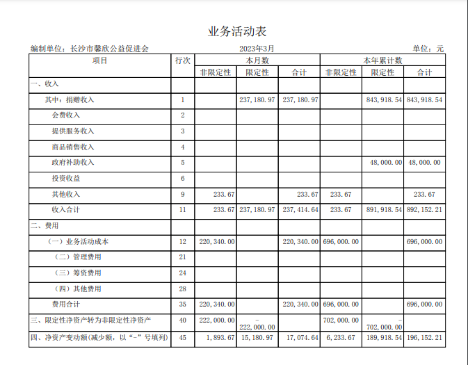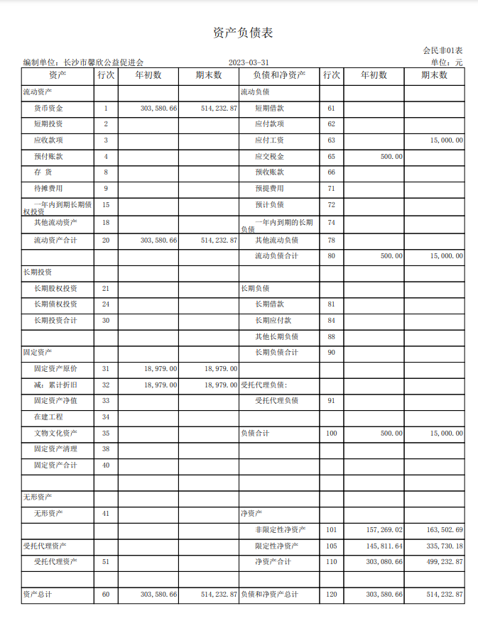 长沙市馨欣公益促进会2023年3月会计报表。长沙市馨欣公益促进会感恩发布。